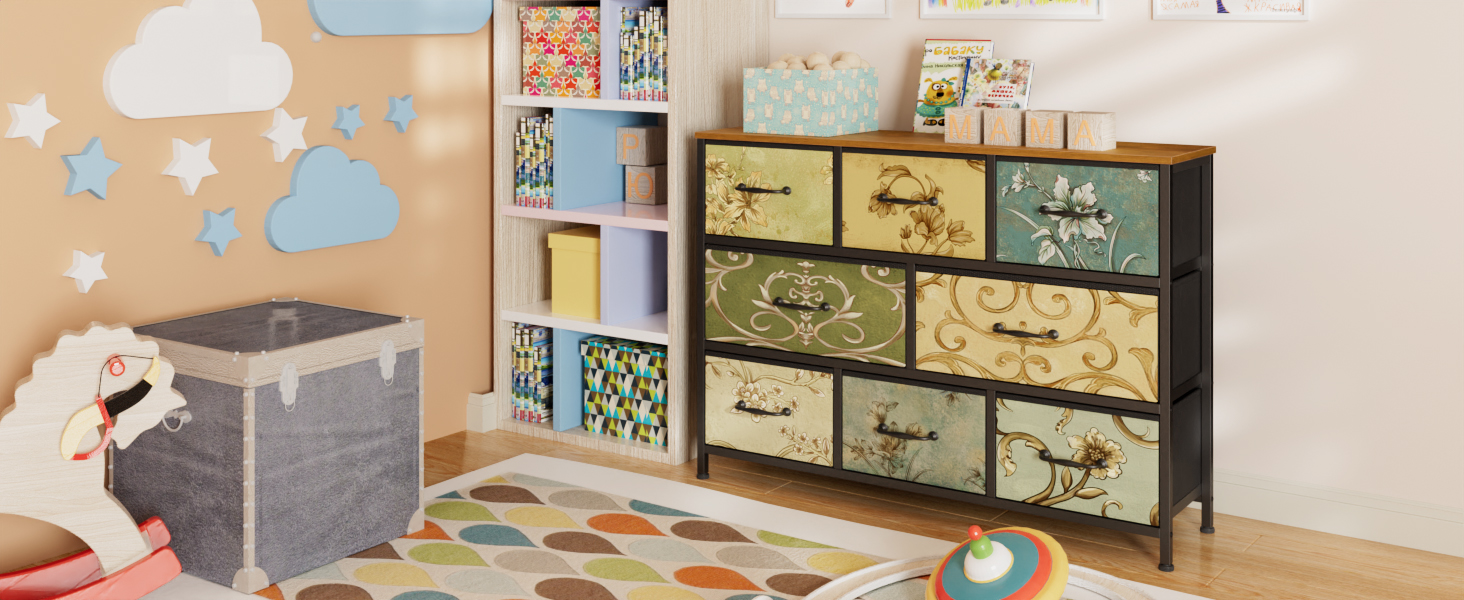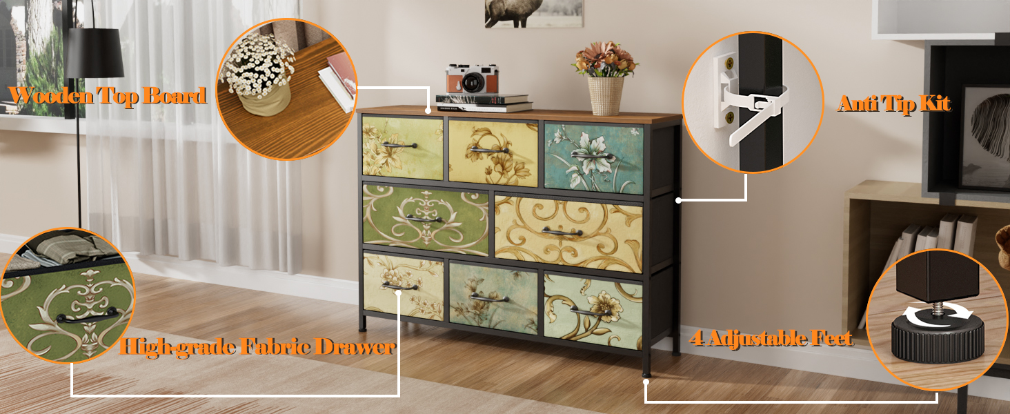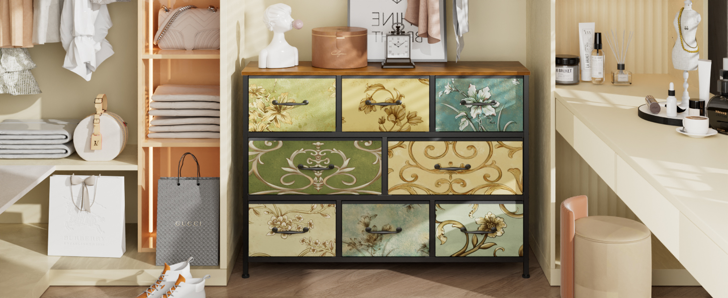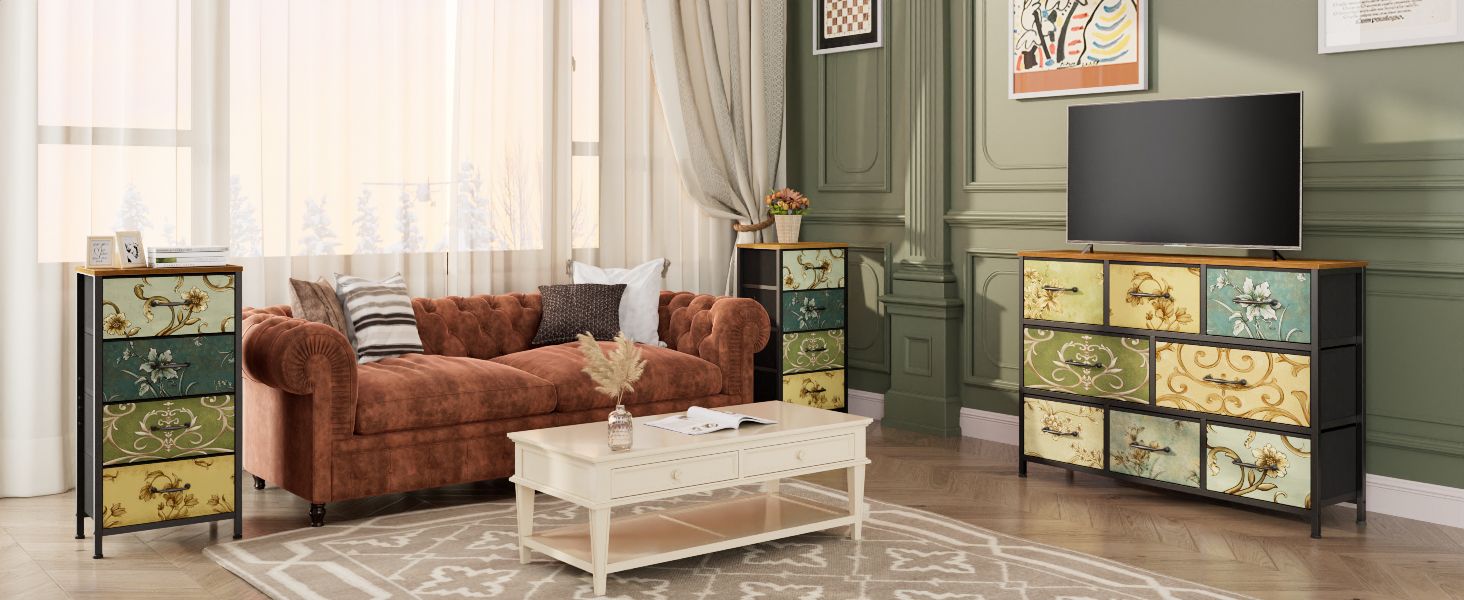 Furnulem dresser with unique floral pattern and color blocking designs can be an accent for modern spaces and also create a new style, producing a special sense of harmony in the collision of classical and modern. It will also add some elegance and charm to your room.
