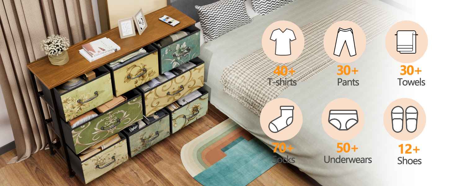 The storage dresser made with sturdy metal frame with wooden top board. Wood top provides hard surface for displaying lamps, alarm clocks, books, eyeglasses, etc. The chest of drawers is also sturdy enough to be used as a TV stand for television up to 50". The fabric bins are great to store CDs, DVDs, game controller, etc.