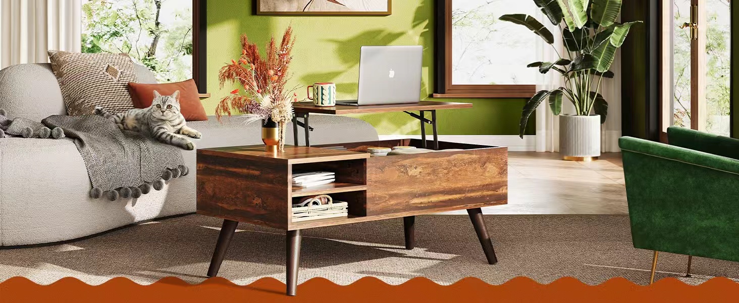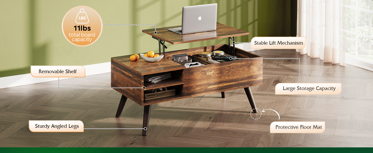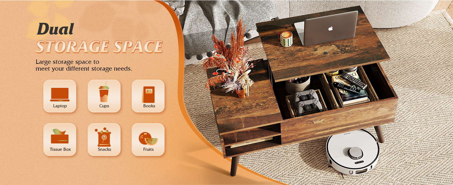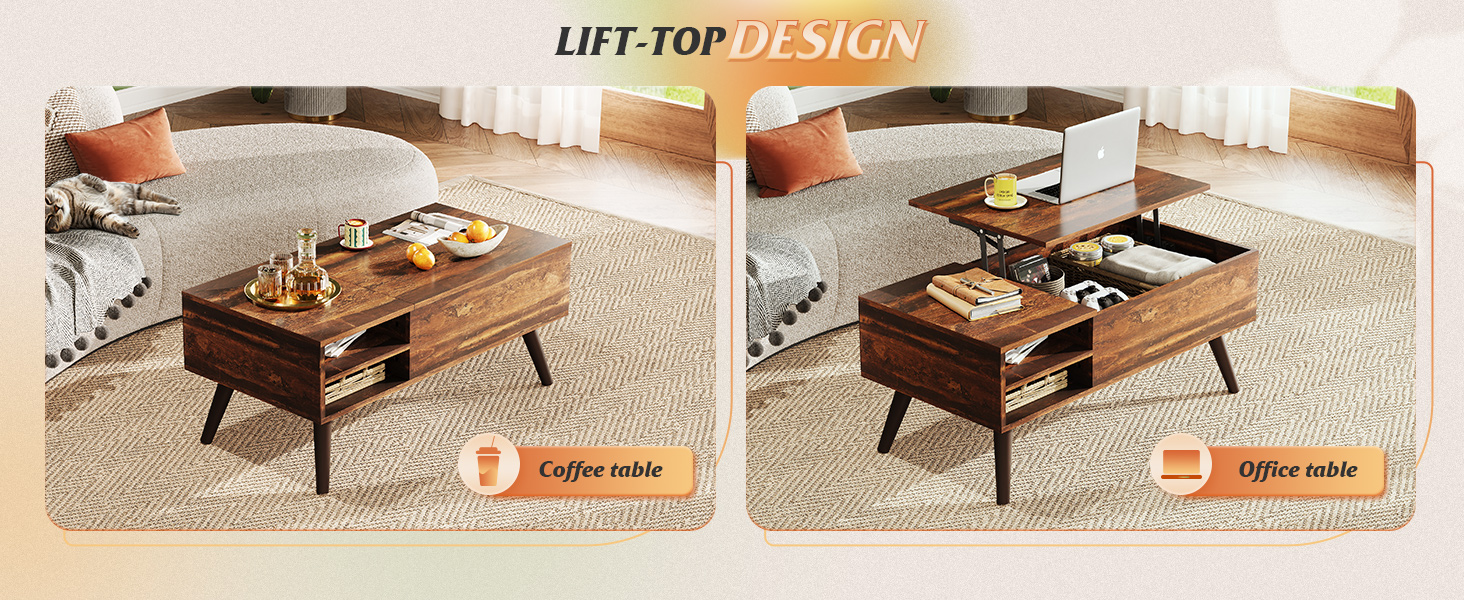When sitting on your sofa, the height of other center table may not be enough. This lift top coffee table has an extending top that lifts up to provide a floating raised work. surface,So you can working,dining and storage living room items here.