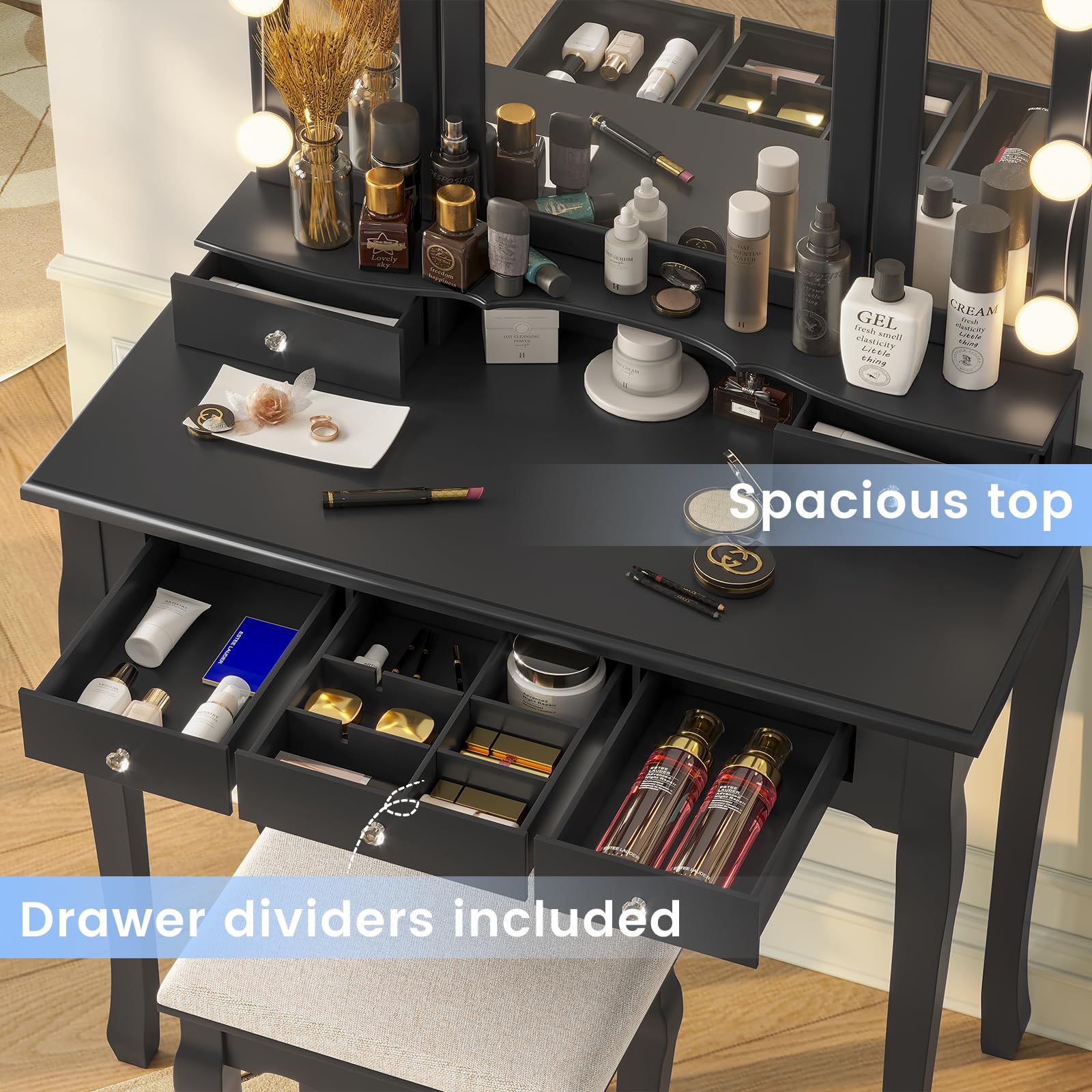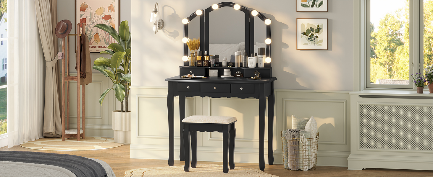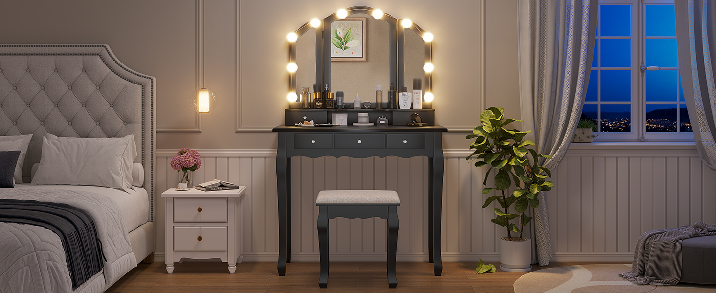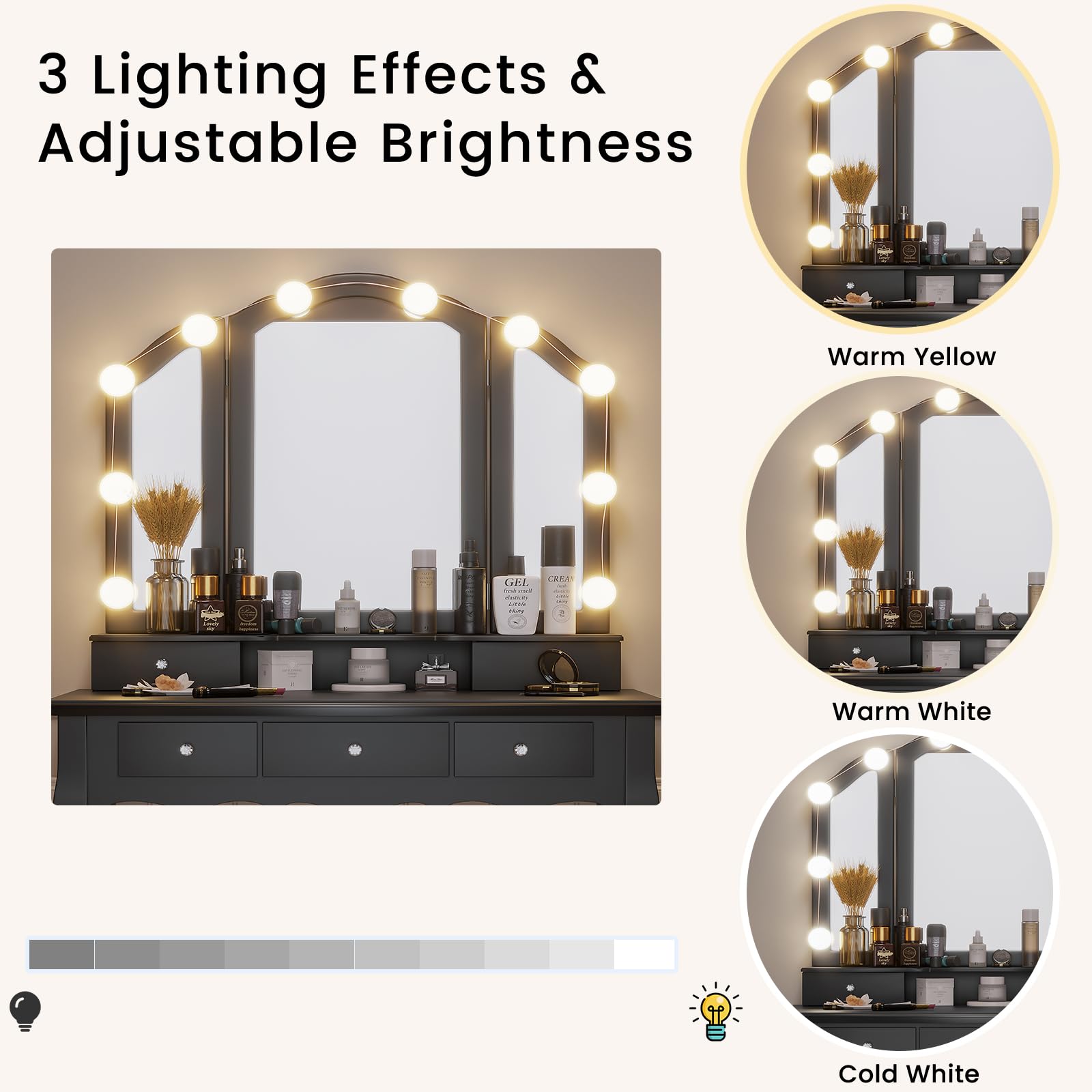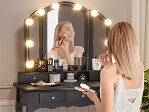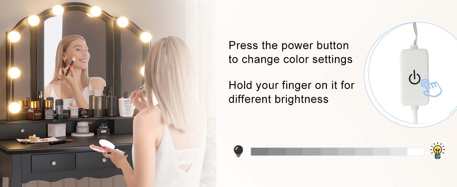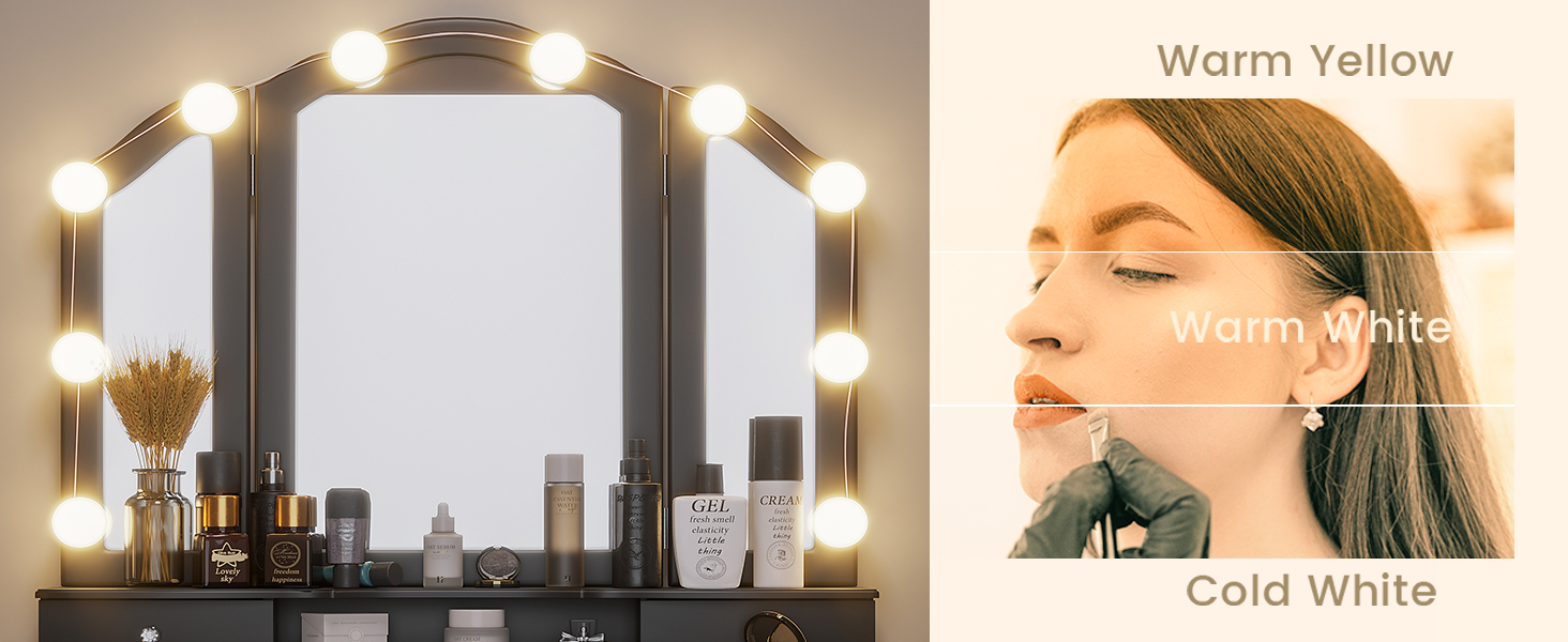 This vanity set features 10 Hollywood dimmable LED bulbs around the mirror. with 3 shades of light: warm yellow, warm white and cool white. No more unflattering shadows across your face. You'll get all you need to set the perfect mood of your beauty station and apply makeup, hairstyling and more.