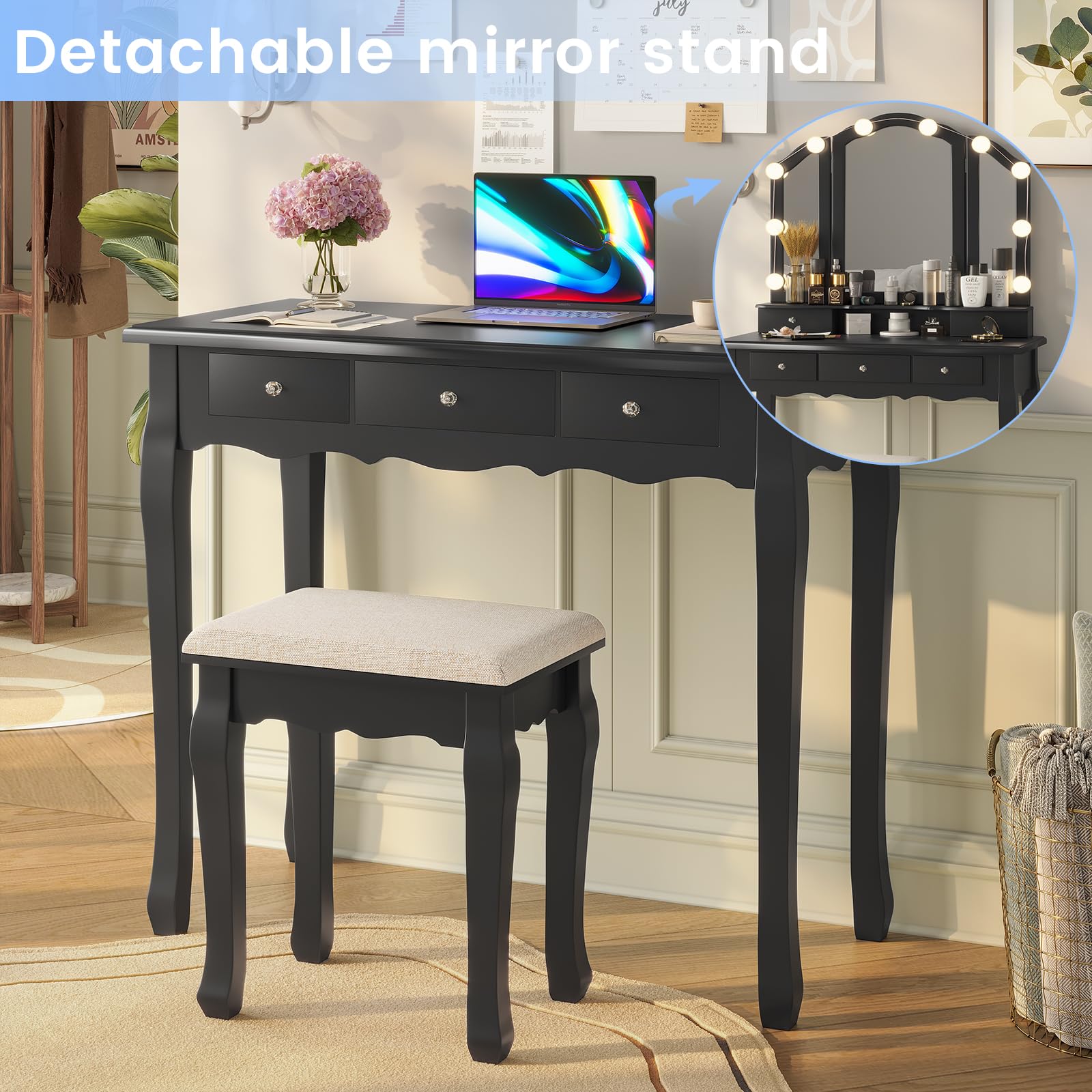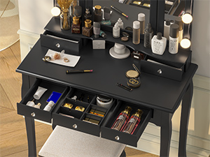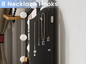 The side mirrors fold 180 degree so you can always find the right angle to perfect your look. And when you fold them up, there shows your favorate necklaces and jewelry on the hooks. Extra bonus! Plus, removable mirror makes it both a vanity and a workstation