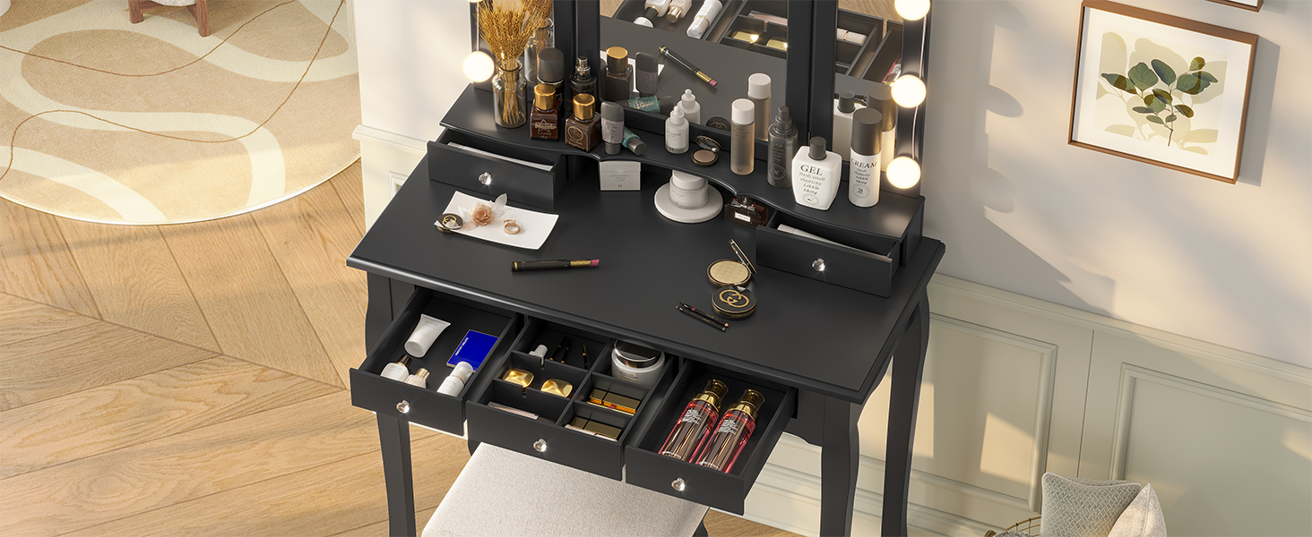 With two smaller drawers and three larger drawers to hold varying-sized beauty products, a 36.5"x 16.1" tabletop and a higher little shelf to hold extra items, this vanity table maximizes your storage while takes up little space.