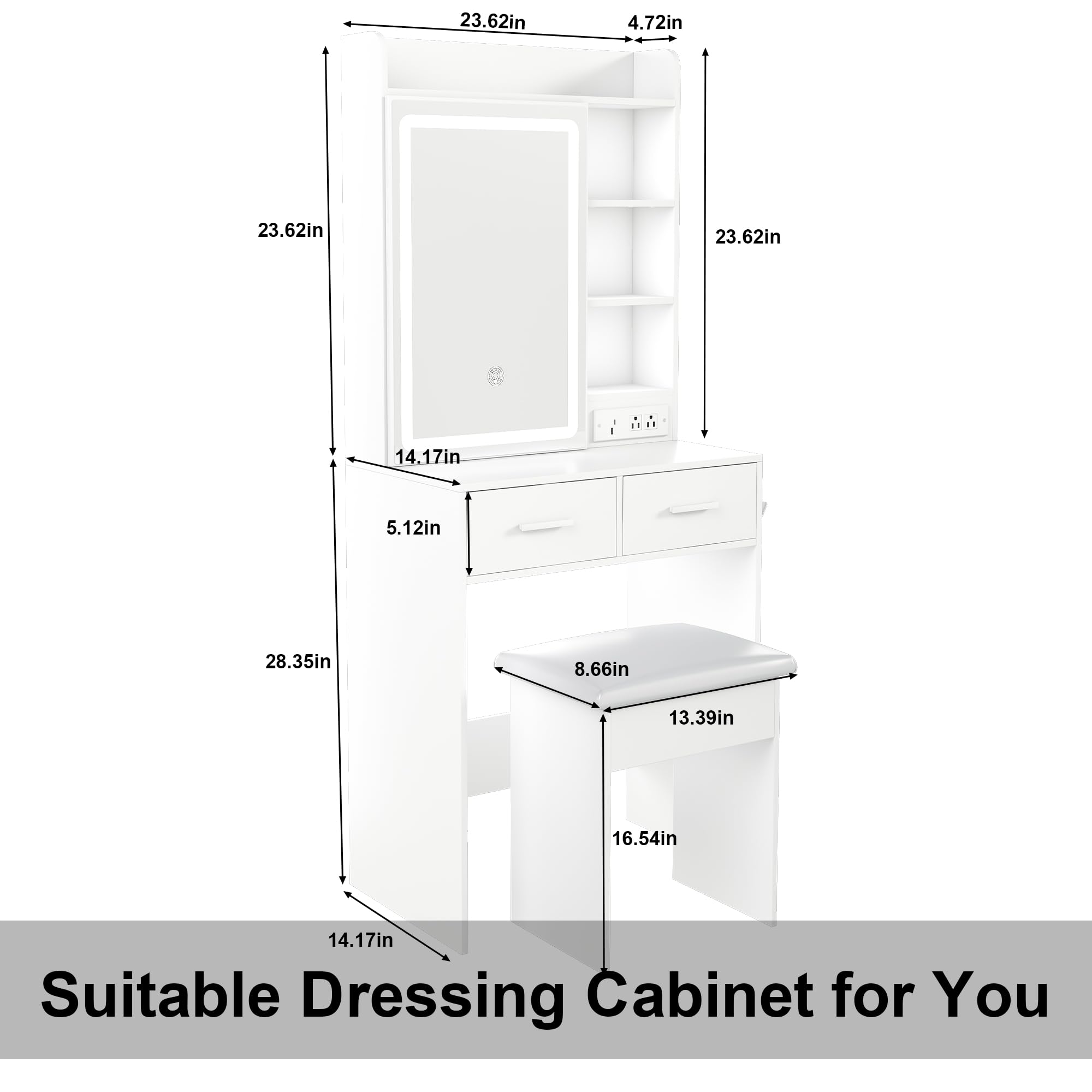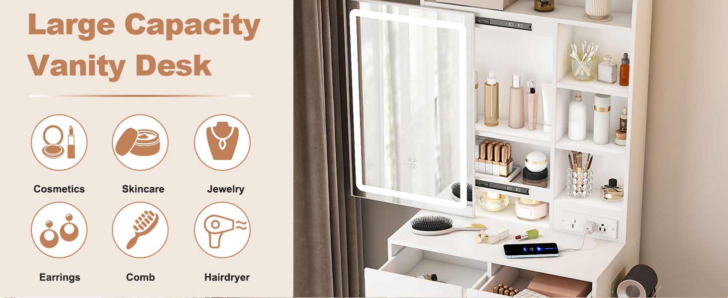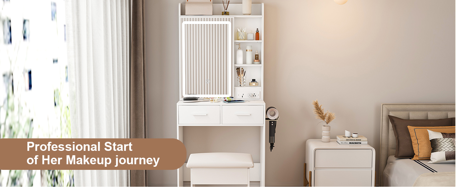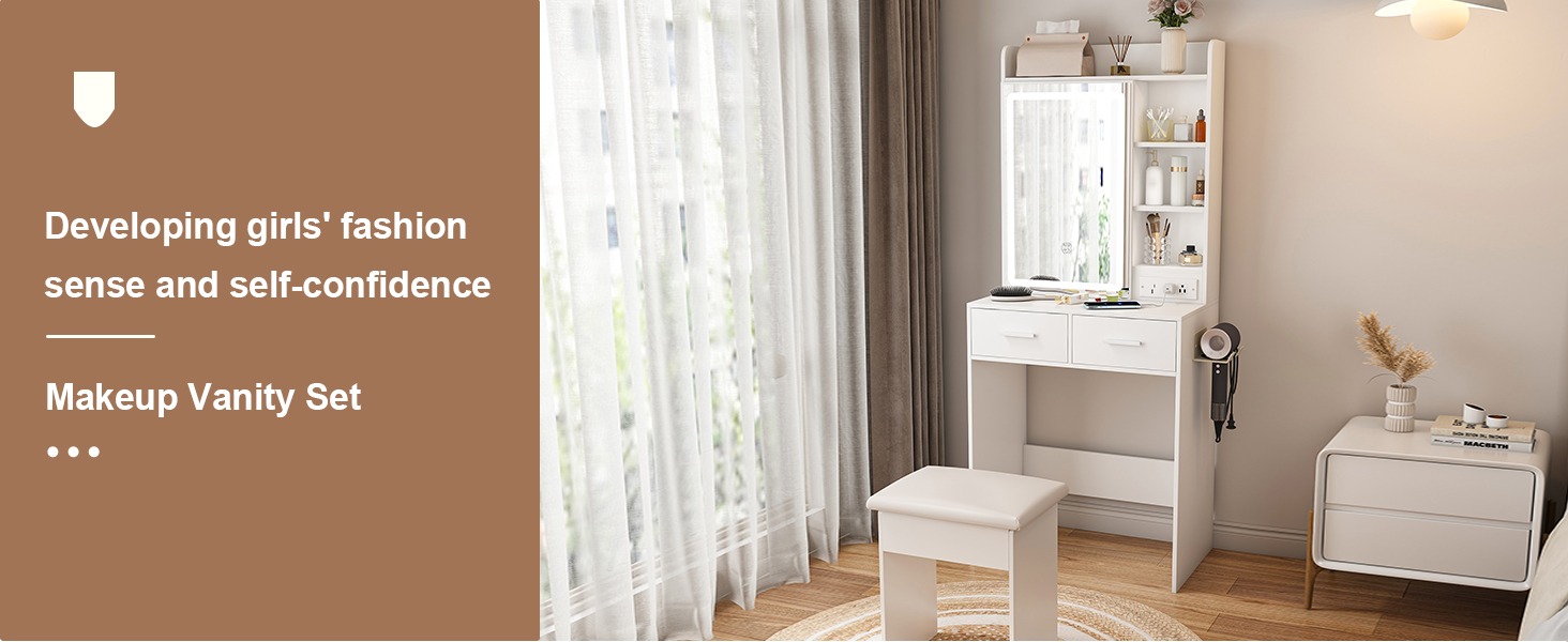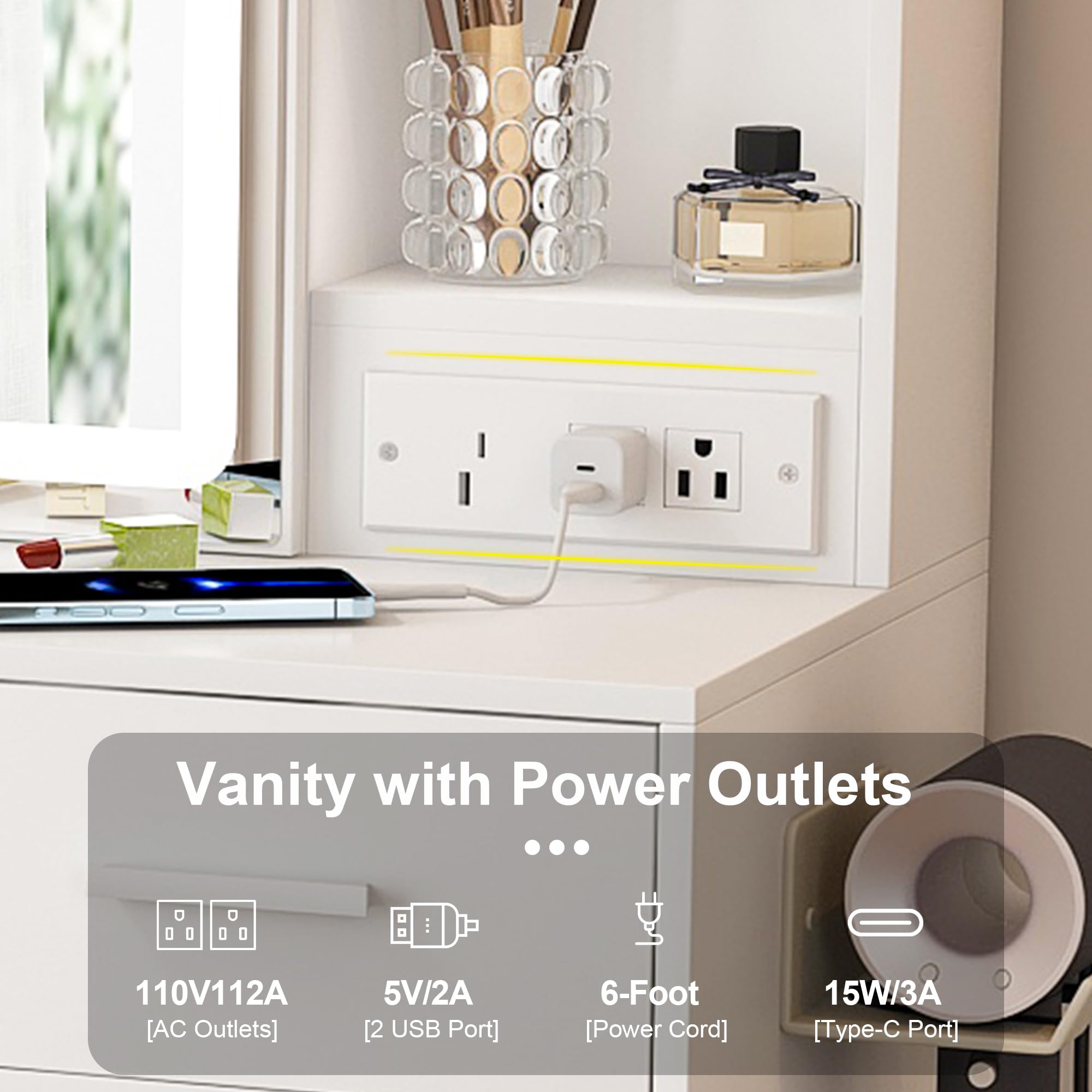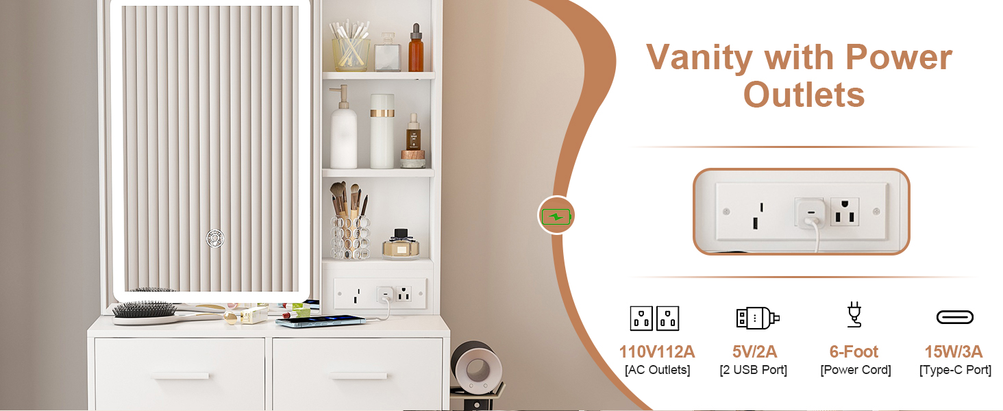 Come with 2 standard plug sockets, 1 USB and 1 Type-C port, makes it convenient to connect your hair dryer, curling iron or charge your phone, tablet or other mobile devices.This small vanity table is ideal choice for apartments and small bedroom.