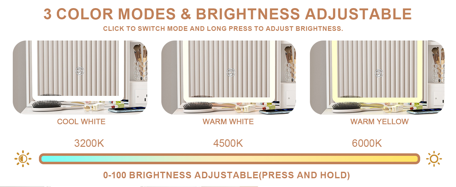 With a high-definition sliding mirror with 3 LED light modes(warm, natural, and cold), easy to change the light color by touch the switch, or adjust the brightness by press and hold the switch.Making it convenient for you to get ready in the morning or for a night out.