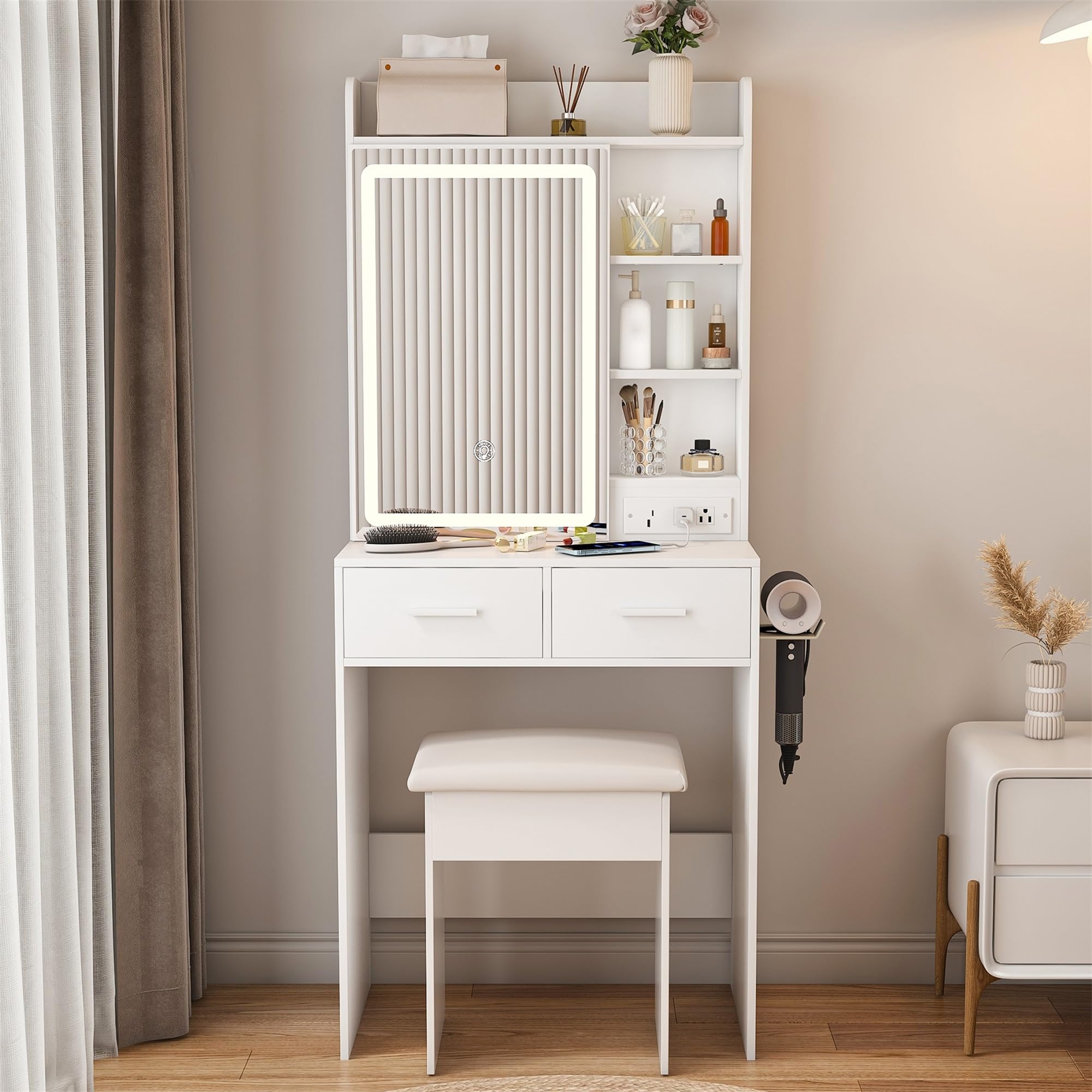With 3 drawers, 3 open shelves.Beside,Added a hairdryer holder for easy access and use.Ideal for organizing cosmetics, jewelry, and beauty tools in small bedrooms or apartments.