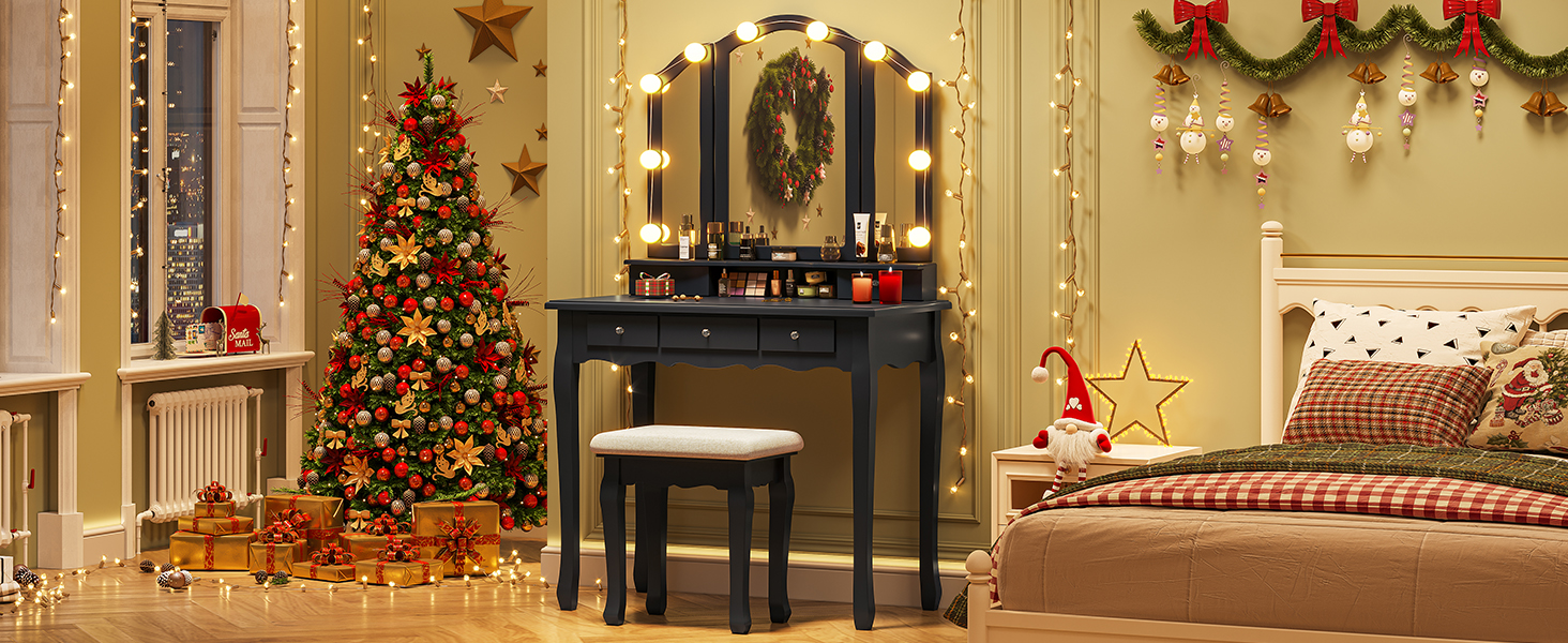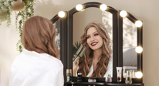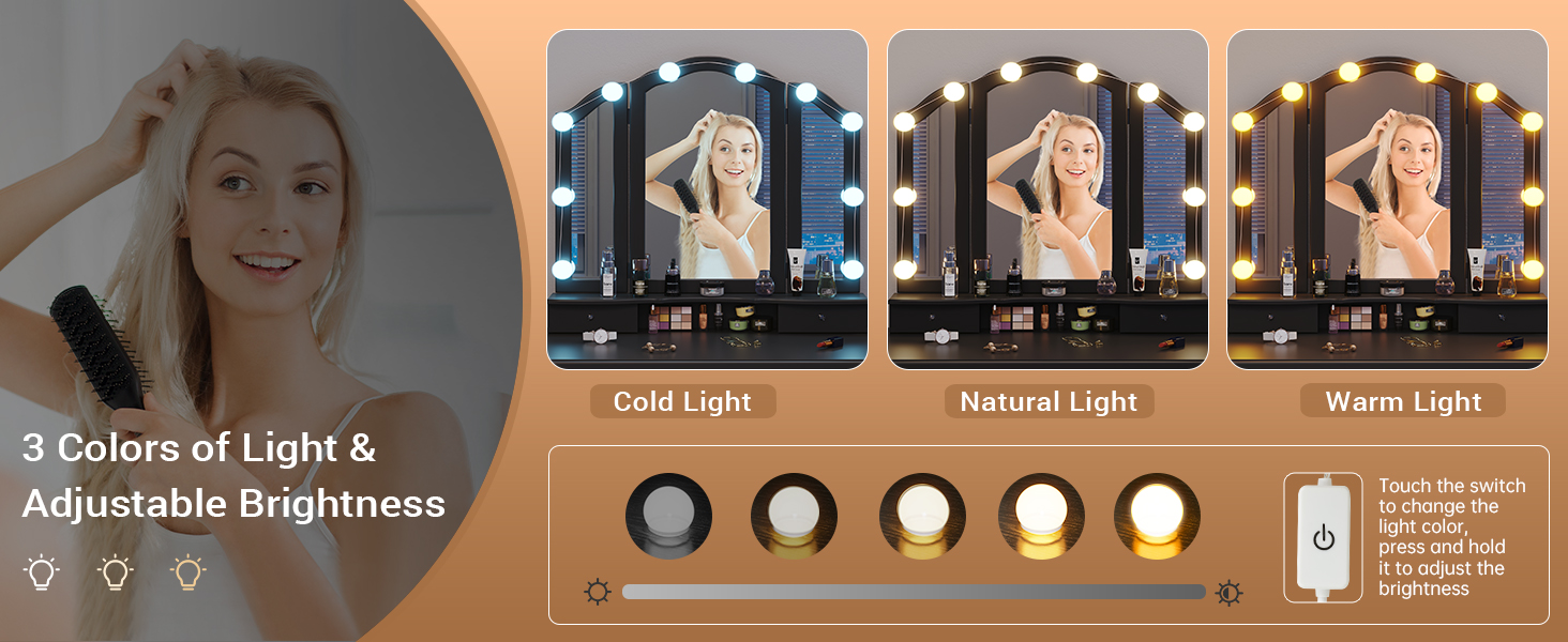 Vintage Yet Stylish, classic Tri-Folding Mirror with 10 Hollywood Style LED Bulbs. There are 3 lighting modes, touch the switch to adjust the modes: ①Warm Yellow - Suit for Night Makeup. ②Warm White - Suit for Indoor Makeup. ③Cold White - Suit for Daily Makeup. Allowing you to makeup in a variety of light conditions with soft and not dazzling light, it’s also a perfect place for yourself to escape and unwind after a long day.