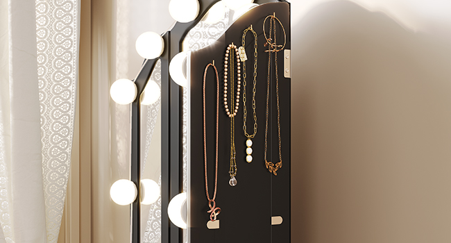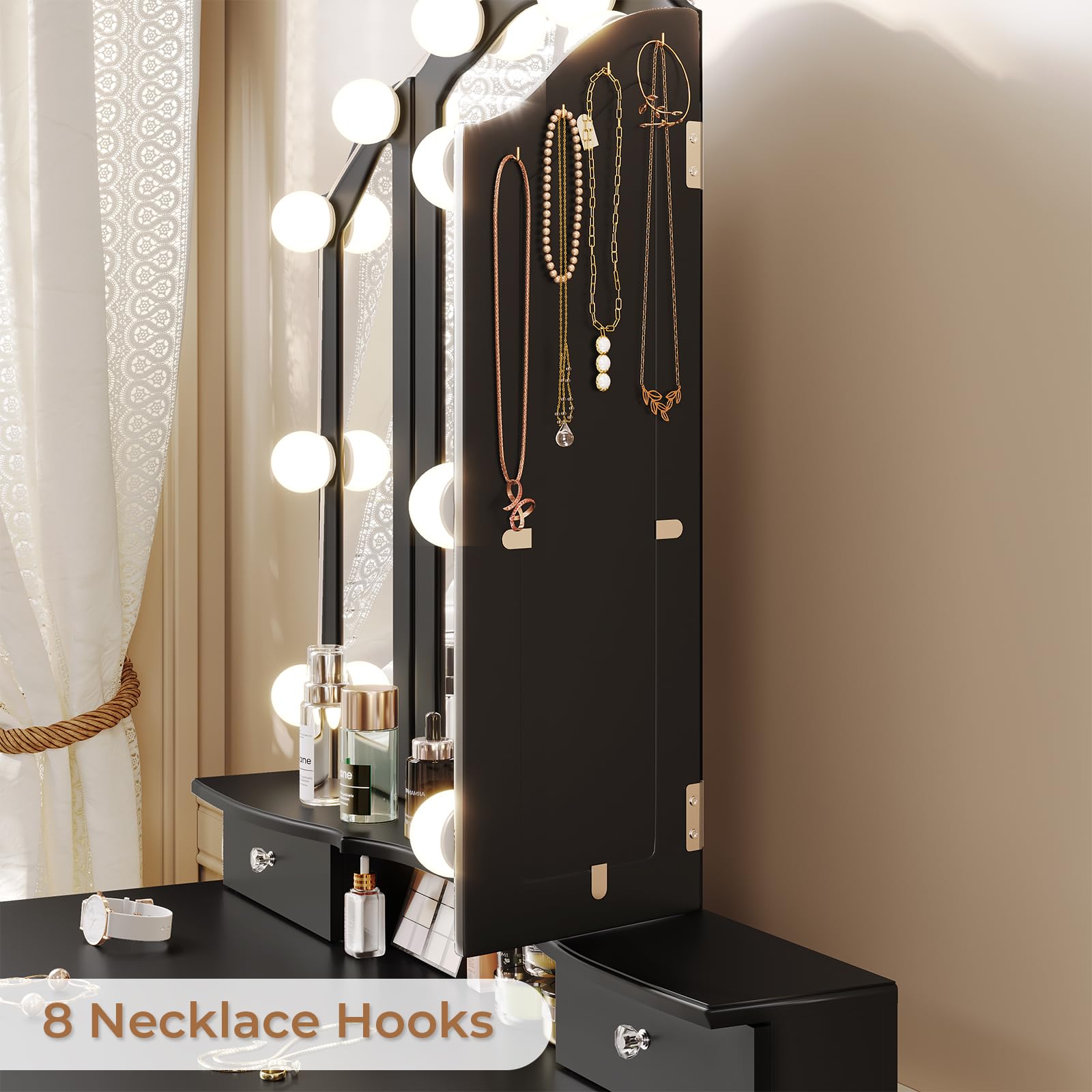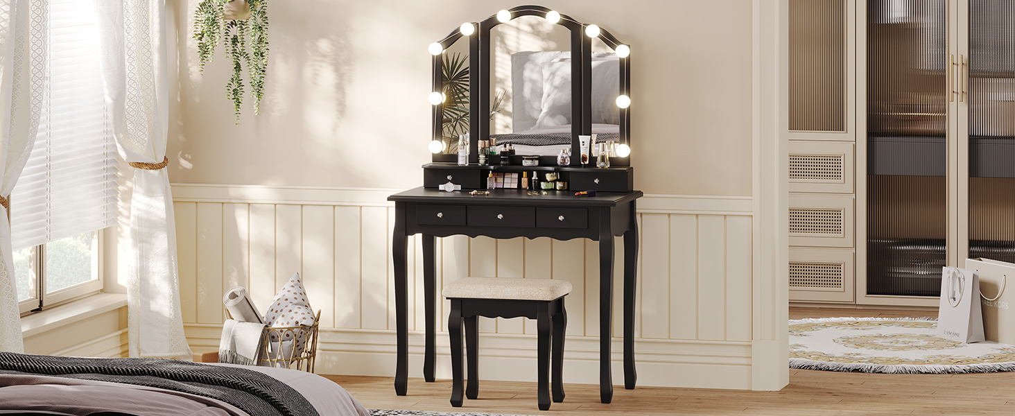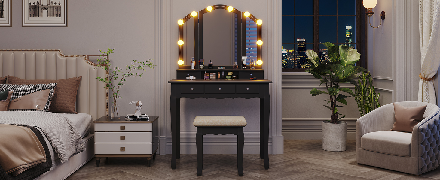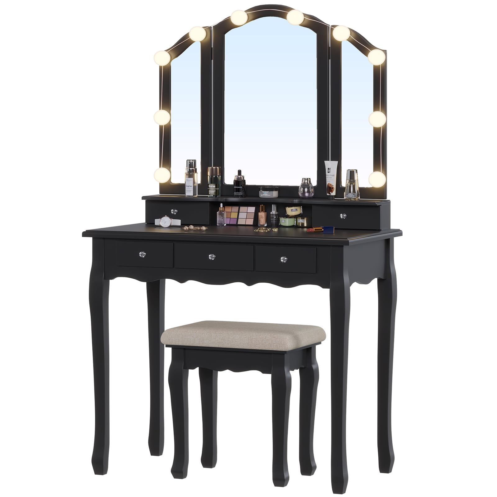 This black-colored vanity table features a three-panel mirror with 10 Hollywood Style LED Bulbs, which allows you to view yourself from multiple angles while putting on makeup or doing your hair, and the 10 bulbs can provide you plenty of brightness, even in the dark.