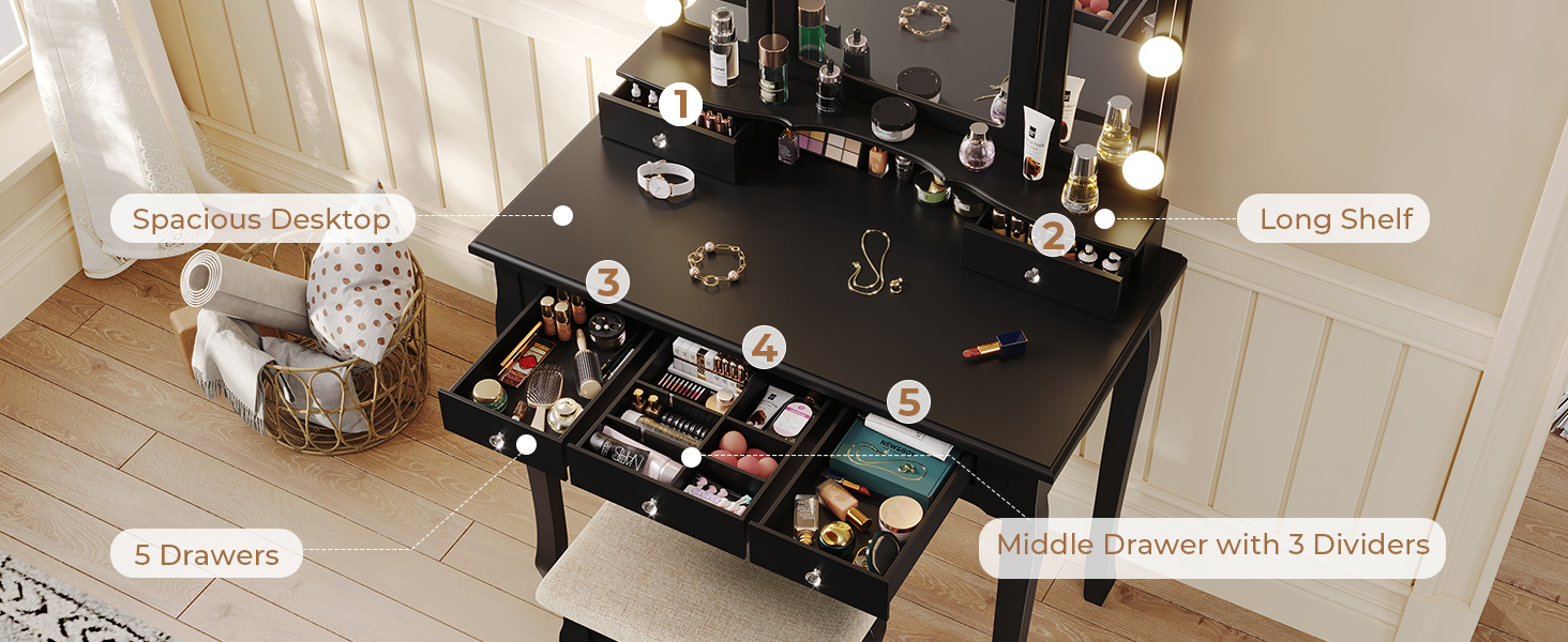 This makeup table features 5 drawers and a spacious desktop provide convenience for you to neatly organize and store all your cosmetics, jewelry, and other beauty essentials. The middle drawer has DIY dividers, you can organize your drawer space according to your needs, there are also 2 sunglasses storage boxes on the desktop.