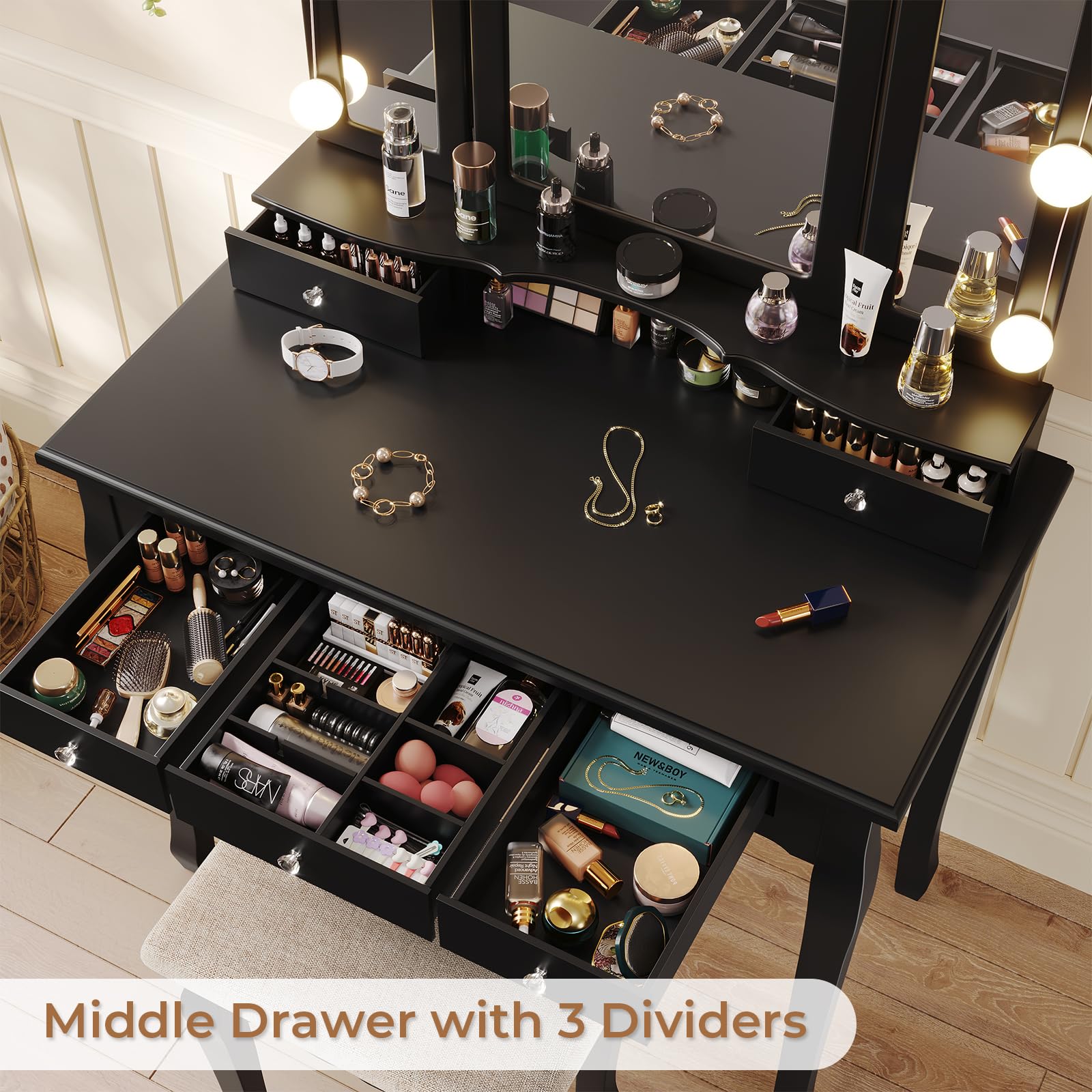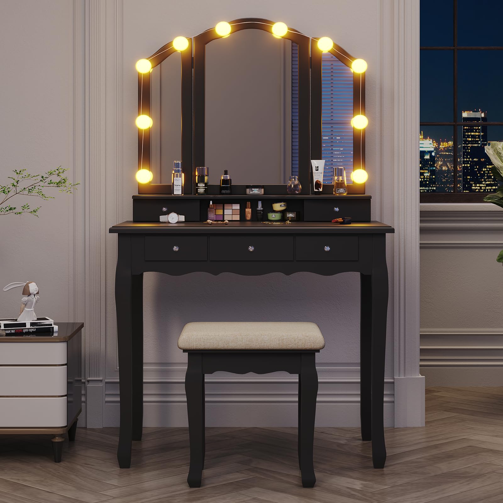 Vanity Table with 5 Drawers and Cushioned Stool, Makeup Table with Tri-Fold Mirror for Women Girls, Black